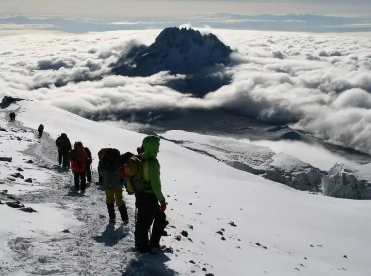 Barafu Camp - Gipfel des Uhuru (5.898 m) - Mweka Camp (3.100 m). Gegen Mitternacht brichst du zum Gipfel, dem höchsten Punkt Afrikas, auf. Der steile Weg bis zum Kraterrand fordert viel Kraft, gute Konzentration und ist eine der größten Herausforderungen auf der ganzen Route. Vom Stella Point zum Gipfel kletterst du Schritt für Schritt hinauf. Endlich oben angekommen, kann die Aussicht genossen werden. Der Abstieg erfolgt über das Barafu Camp und von dort weiter zum Mweka Camp.