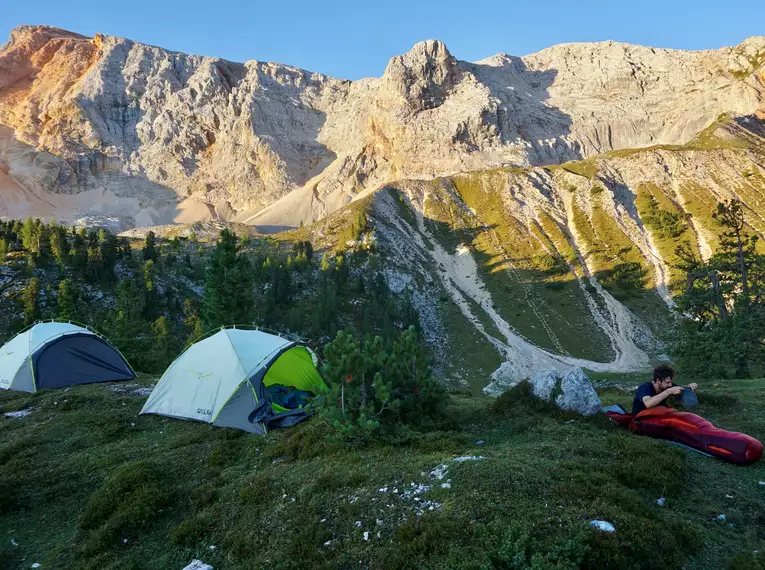 Die Nächte hingegen verbringen wir draußen im Freien und gehören dem ungefilterten Sternenhimmel, solange der Wettergott mitspielt. Bei Regenwetter bietet der Stubenboden die ersehnte Alternative für unsere Matte und unseren Schlafsack. Die Authentizität der Dolomiten erleben wir allein schon durch das Wandern abseits der touristischen Ströme, auf abgelegenen Pfaden und im weglosen Gelände. Unsere Bergführer kennen nicht nur die einsamsten Routen, sie bauen sogar temporär exklusive Klettersteige, die, nachdem die Gruppe passiert ist, wieder abgebaut werden. Auch die echten Begegnungen mit den Menschen, welche die wunderschönen, aber auch kargen Gegenden der Dolomiten bewohnen und bewirtschaften, sind wichtiger Teil dieser drei Tage. Vom großzügigen Hüttenwirt, welcher nur für uns kocht, bis zur taffen Hirtin, deren Schafe wir in deren Nachtlager begleiten dürfen, lernen wir Persönlichkeiten kennen, wie sie nur die Berge zeichnen können.