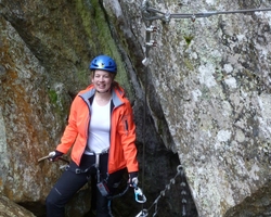 Wir treffen uns gegen Mittag mit unserem Bergführer, auf Grund des etwas unbeständigen Wetters haben wir beschlossen, die Kurzvariante zu wählen, die ca. 2,5h dauert. Zunächst laufen wir einen kleinen Pfad hinunter zum Einstieg des Kettersteigs.